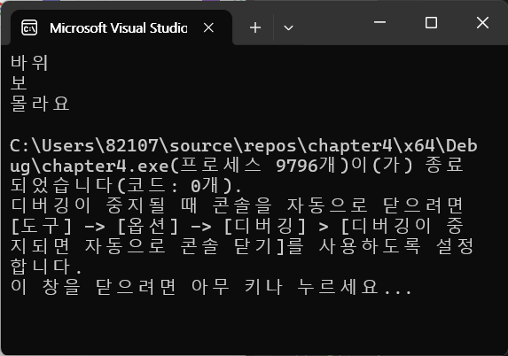 실행 결과, 가장 먼저 '바위'가 나온 것을 보니 아마 i의 값은 1이었던 것 같다.