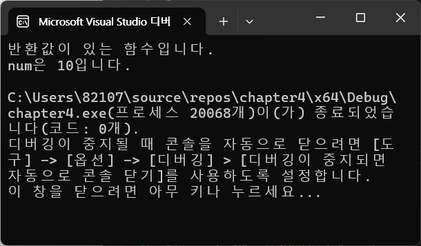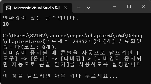 함수 본문에서는 '반환값이 있는 함수입니다.'를 출력하고 10을 반환하게 만든다.