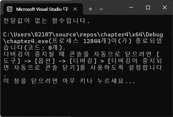 이처럼 반환값이 없는, void로 선언한 함수 역시 main() 함수에서 호출할 수 있음을 알 수 있다.