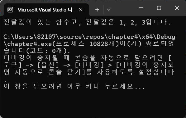printf("전달값이 있는 함수고, 전달값은 %d, %d, %d입니다.\n", 1, 2, 3);